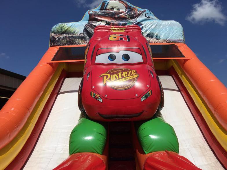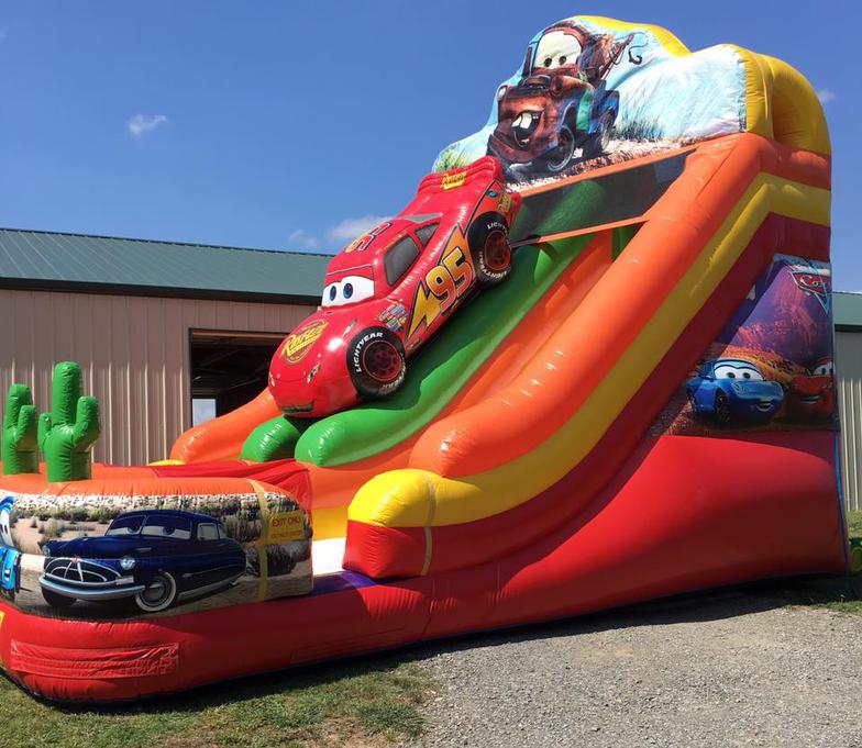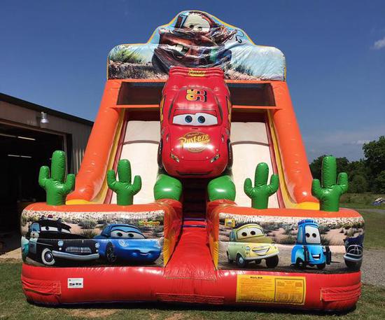 This licensed Cars Double Lane slide will bring fans from Carburetor Country running with a whimsical design and exciting two-slide option. Kids can climb up the center tunnel, which is topped off by a three-dimensional Lightening McQueen, and then choose from either a right- or left-sided slide for a speedy ride to the cushioned bottom. Mater, the fun-loving truck sits in artwork atop the dual-lane slide, while guests from Radiator Springs fill the bottom art panels, and 3D cacti flank the end of each racing-inspired dry slide. This Cars Double Lane slide is sure to please everyone at your next event.