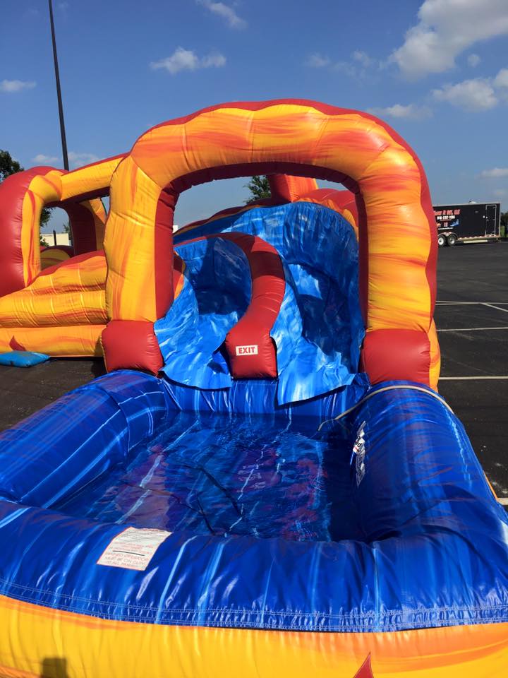 Our 27ft Lava Twist with Pool will surely blow you out of Water! Riders come zooming down the water slide into a 90 degree turn which features a banked wall and finally landing into a pool!