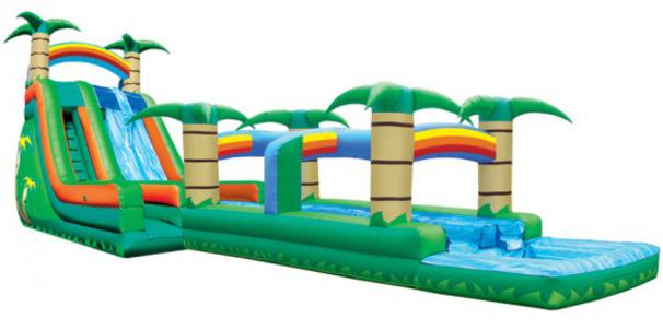 Our 22ft Tropica Waterfall 2 Lane Water Slide features a radical sliding angle that's sure to get the adrenaline pumping. At the bottom, riders continue down 26' of additional sliding fun before landing in the pool. This water slide will blow your mind! It's perfect for schools, churches, summer camps and more. Fun for all ages!