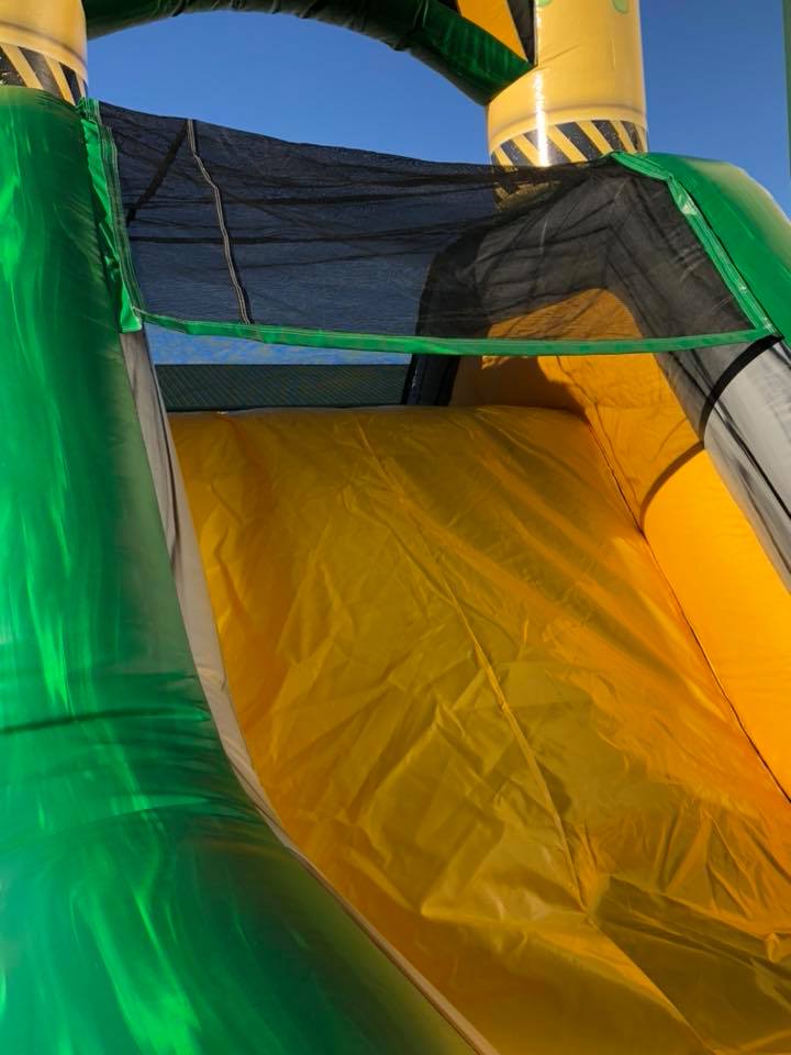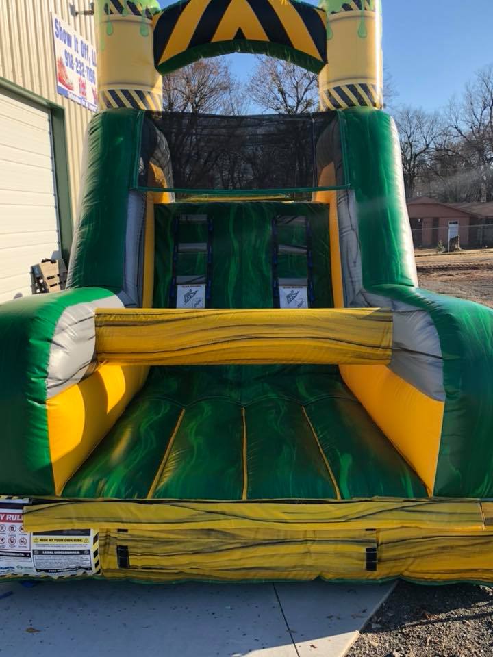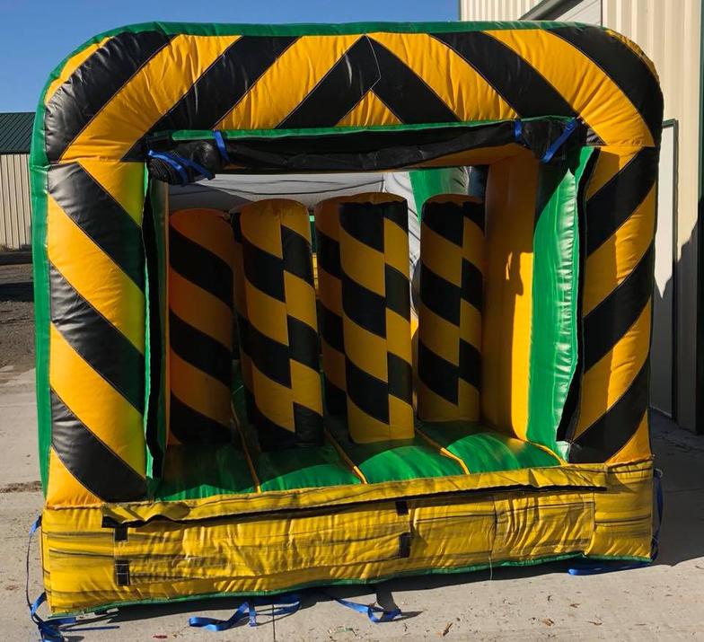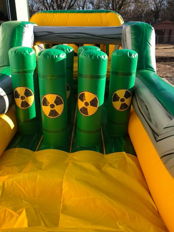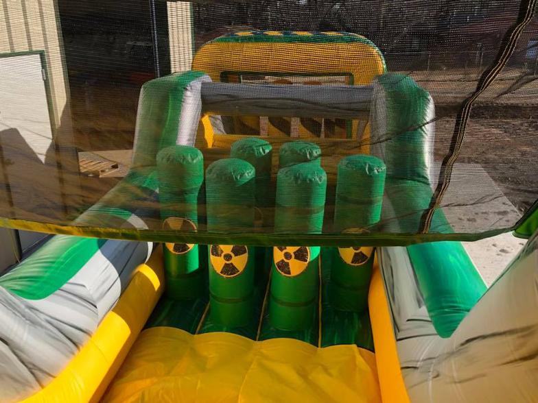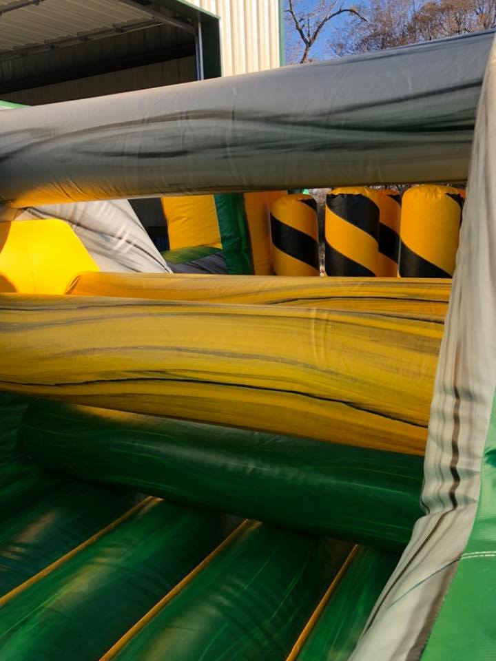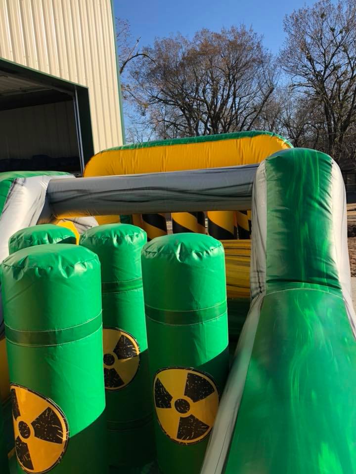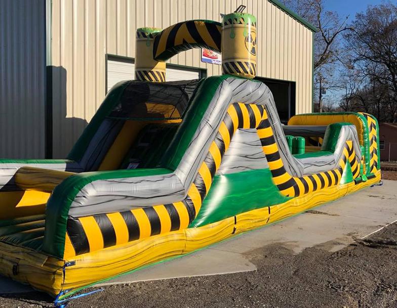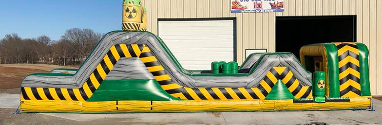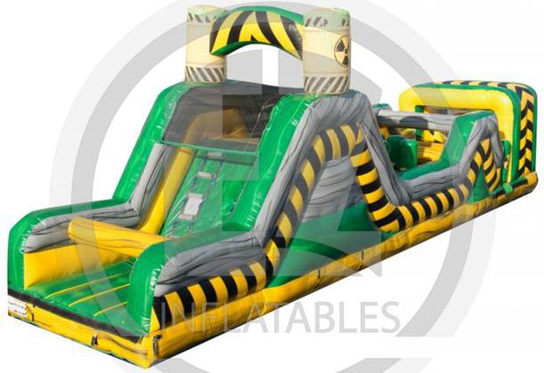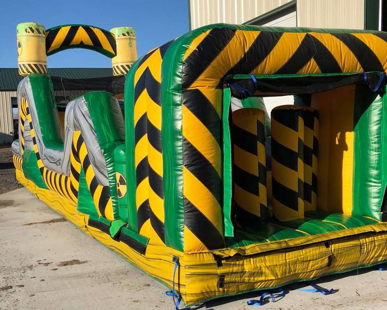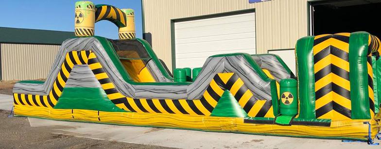 The Inflatable 40ft Obstacle Course is an oversized inflatable play structure with a Toxic theme. This Obstacle Course is set up for friendly competition play, with dual entrances and exits. Challenge your friends thru the pop ups, log obstacles, & slide. Great for all ages!