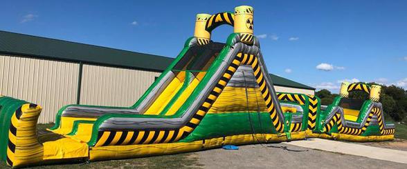 The Inflatable 86ft Obstacle Course is a 2 piece inflatable structure with a Toxic theme. This Obstacle Course is set up for friendly competition play, with dual entrances and exits. Challenge your friends thru the small slide, pop ups, log obstacles, & then the large toxic slide. Great for all ages!