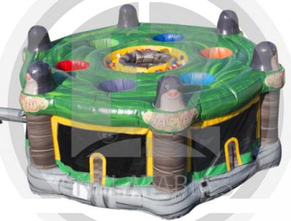One player takes the inflatable hammer and stands in the middle of this game. Other players pop their heads up in the other holes and try to grab a ball. If they are wacked, then they must go back in the hole. The player that collects the most ball is the winner. This game is complete with an Inflatable Hammer, balls, and headgear.