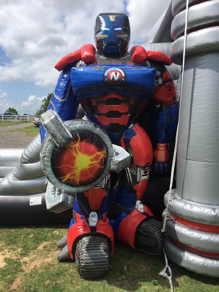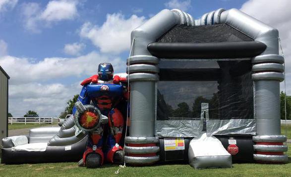 Transform your next party into a galactic bash with this Robot combo. Kids can bounce in this unique bouncer and then climb the stairs and escape by sliding down the slide. Featuring special metallic vinyl and a photo-realistic giant robot, this inflatable is just about perfect.